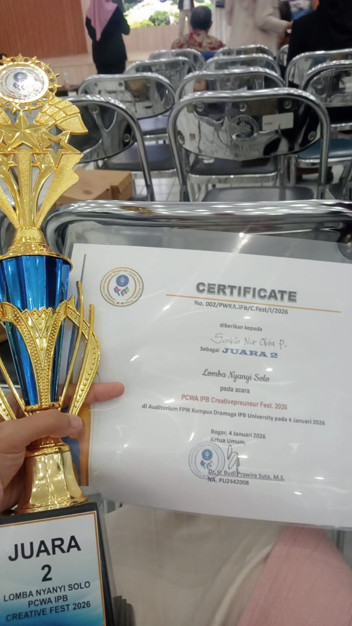 Saskia, siswi kelas XII MPLB 4, berhasil meraih Juara 2 Lomba Menyanyi Solo dalam ajang IPB Creative Fest 2026 yang diselenggarakan di IPB University – Fakultas Perikanan dan Ilmu Kelautan, Bogor.
